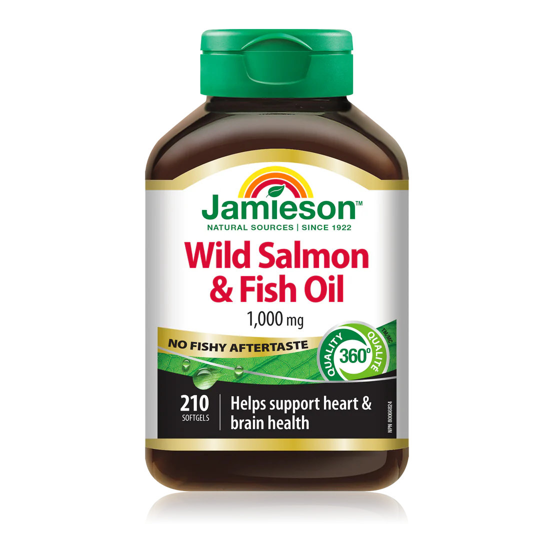 Jamieson Wild Salmon & Fish Oils Omega-3 Complex is a blend of fish oils providing an excellent source of Omega-3 essential fatty acids EPA and DHA to support heart and brain health. This product is pharmaceutically tested and guaranteed to be free from heavy metals including mercury and lead.